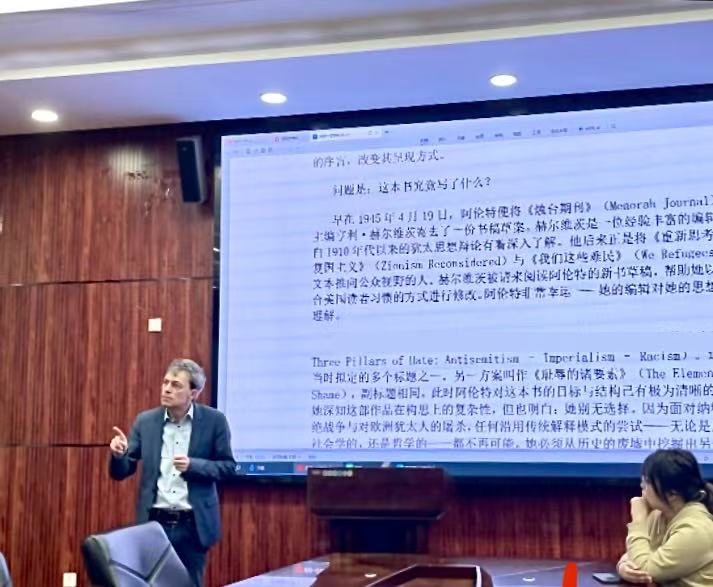讲座伊始,托马斯·迈耶教授指出,理解汉娜·阿伦特思想的关键在于把握其“生命与思想的统一性”。他强调,汉娜·阿伦特是一位将个人生命经验与时代剧变深刻融合的思想者。她的思想道路无法以学科体系归类,需通过“传记性方法”加以理解——即在其生命历程与思想发展的交织中,探寻她对二十世纪人类境况的深刻回应。托马斯·迈耶教授系统梳理了汉娜·阿伦特思想发展的几个关键阶段:从早期关于奥古斯丁“爱的概念”的博士论文,到对犹太问题的历史-社会学分析;从与卡尔·曼海姆的思想对话,到其哲学代表作的成书过程。托马斯·迈耶教授指出,汉娜·阿伦特构筑了一种融合历史、社会学与哲学视野的跨学科理论,以直面“时代断裂”带来的根本挑战。