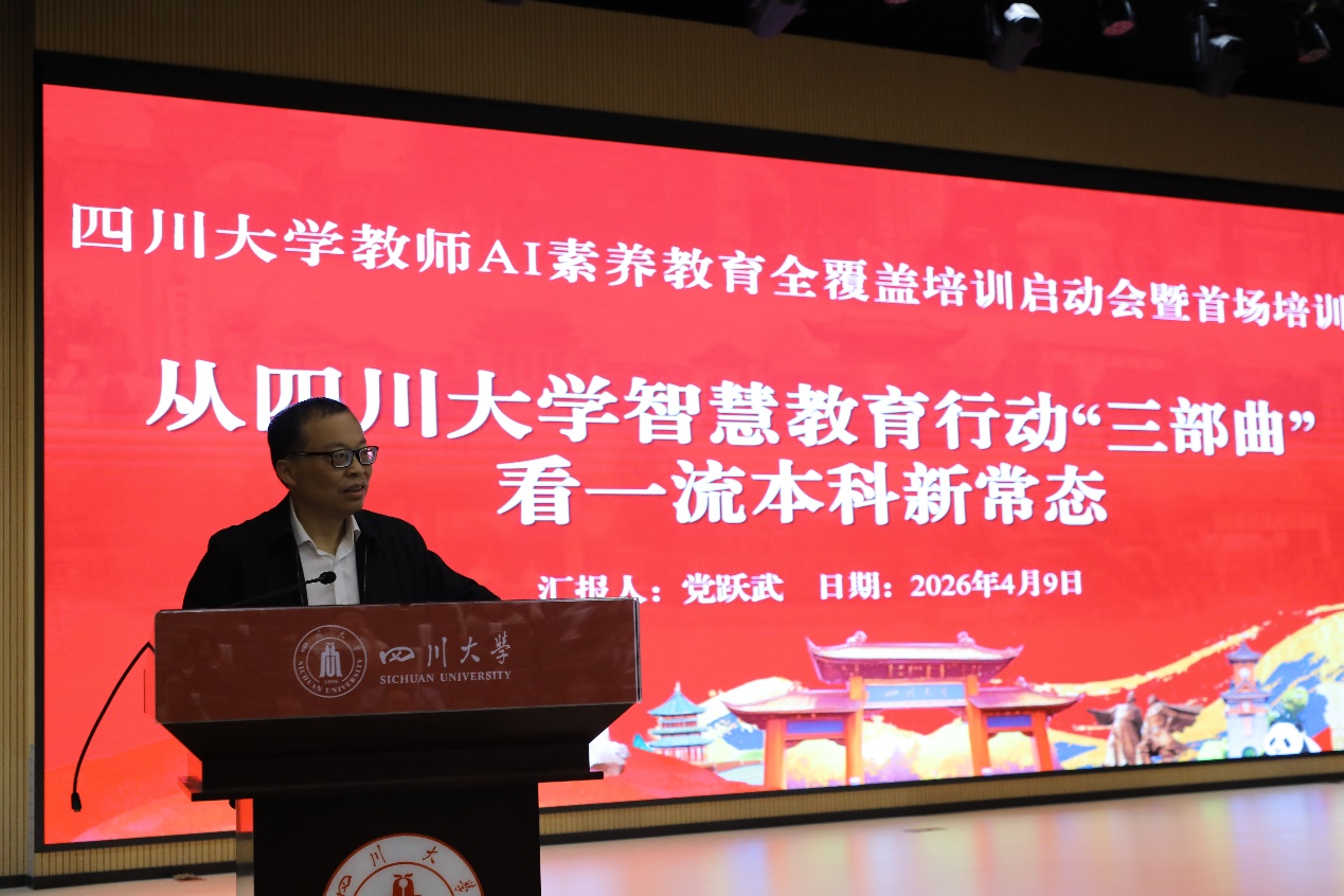 启动会上,教务处处长党跃武教授以《从四川大学智慧教育行动“三部曲”看一流本科新常态》为题做主旨报告,全面阐释了学校“智慧教育行动三部曲”基本精神,系统解读了以“AI赋能—创新使能—改革善能”为主线的智慧教育行动路径,着力构建“师—生—机—环”四元协同的智慧教学新生态。